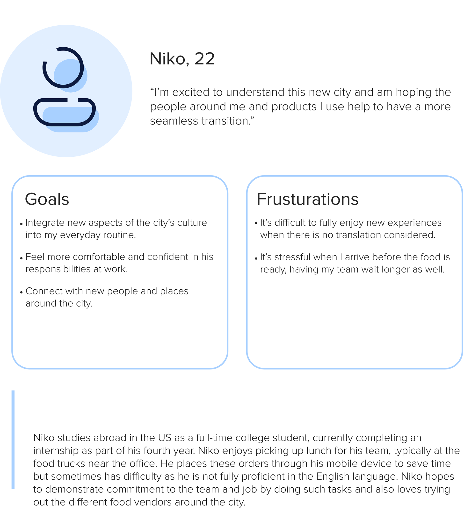 The journey is built upon Niko's profile, a 22 year old student who studies (hospitality management) abroad in the US. Originally from Brussels where his mom, dad and sister reside, he now lives with two roommates in New York City. He is currently completing a summer internship at a large international real estate firm to gain industry experience and expand his interpersonal skills in a new culture and language.