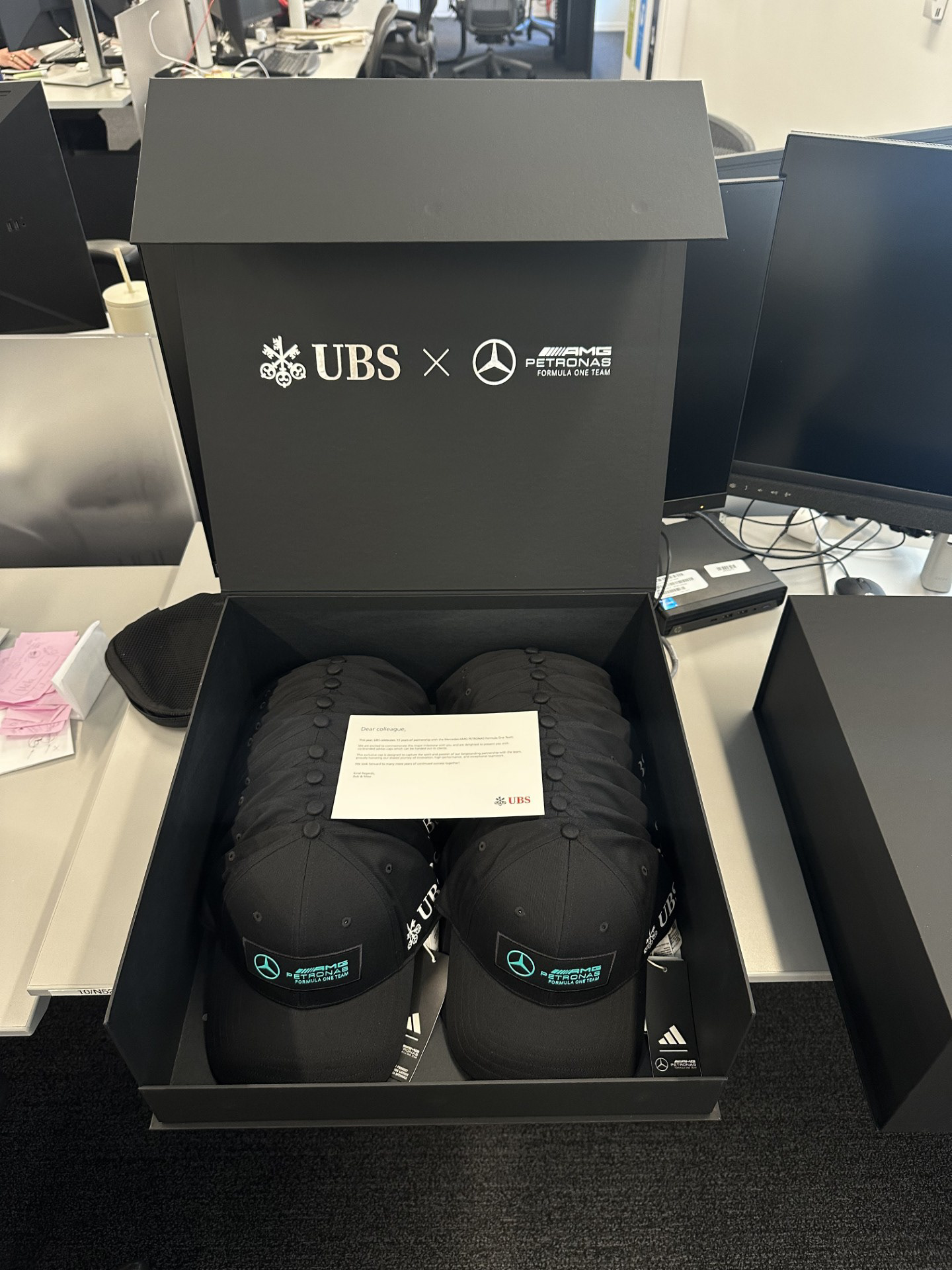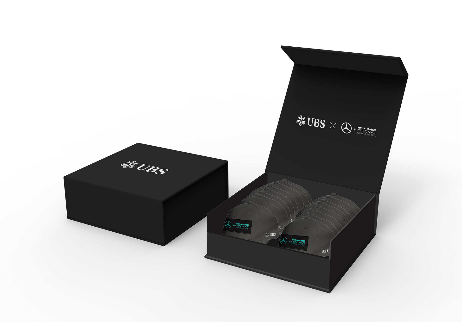 As part of a long-standing partnership, a luxury branded gift box was created to house the F1 UBS x Mercedes-Benz caps. The boxes were distributed to senior management and 250 Wealth Management branches across the U.S., allowing Financial Advisors to present them as client gifts.
