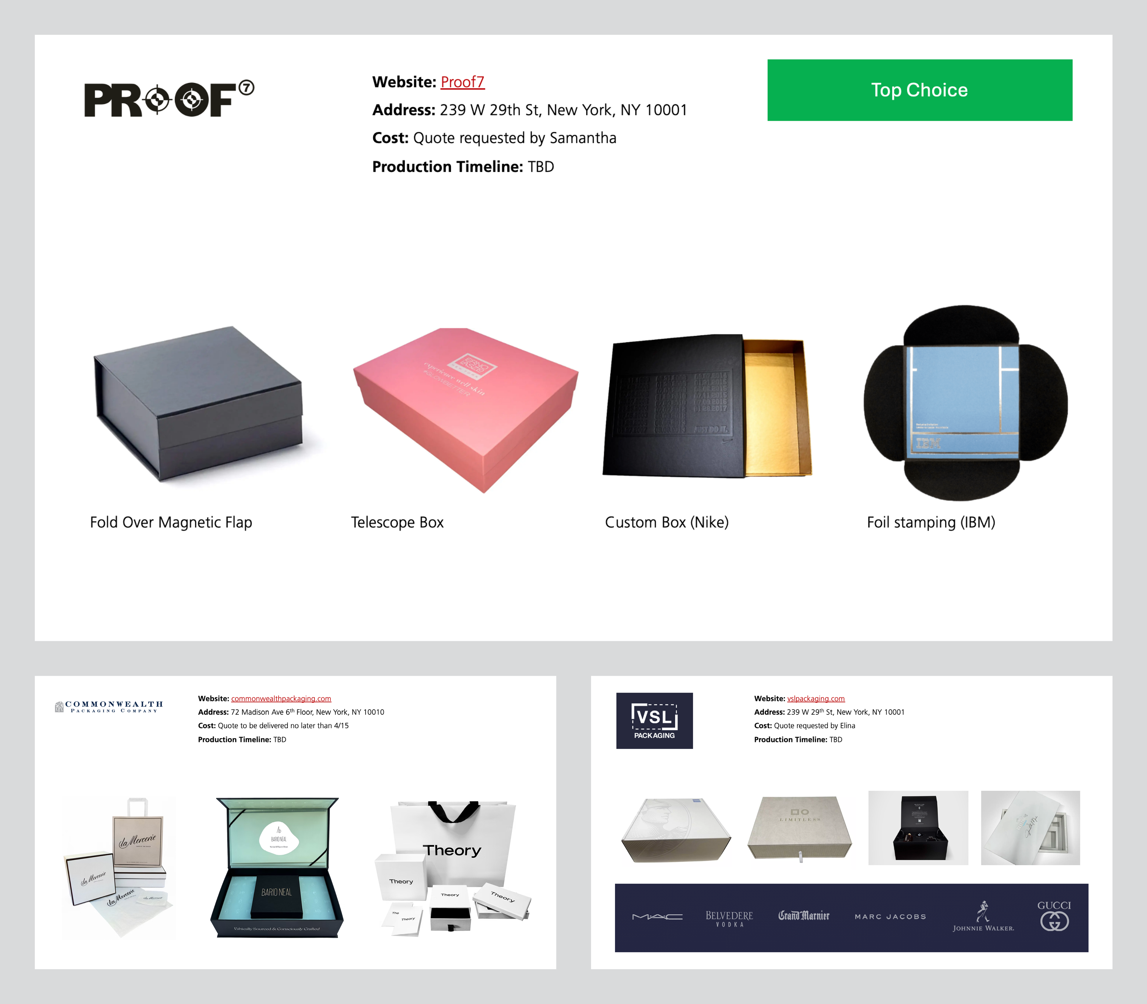 As a first step, the team and I researched New York–based packaging vendors and identified our top three options. Once we agreed on the most suitable vendor, we collaborated with them to obtain detailed, customized quotes and a range of packaging options, which were then shared with broader internal stakeholders for review.